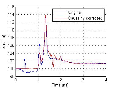與S參數相關的作業皆可透過套件組完成ADK 是一套可以將許多設計人員經常碰到的信號完整性問題簡化成單鍵處理的工具套件組,目前已由許多主要的硬體商所採用多年。透過 ADK, 新進人員可在一日內學會一個中階信號完整性工程師所能處理的問題。例 1 ADK 可校正因果性的問題 (causality violation) 並重新輸出新的 Touchstone 檔案以便進行更佳的 channel simulation 及阻抗讀取。下圖為因果性校正前後之差異性。