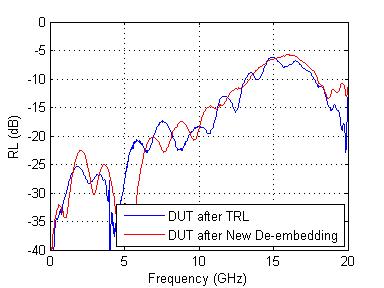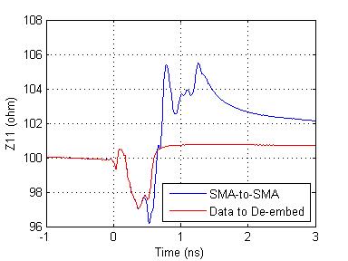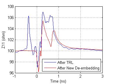 由於 TRL 校正板以及實際 DUT test fixture 之間仍存在阻抗的差異,導致如下圖的 non-causal 現象。 而 ISD 的結果可校正此現象,也可同時觀察 return loss 的結果也大不相同。