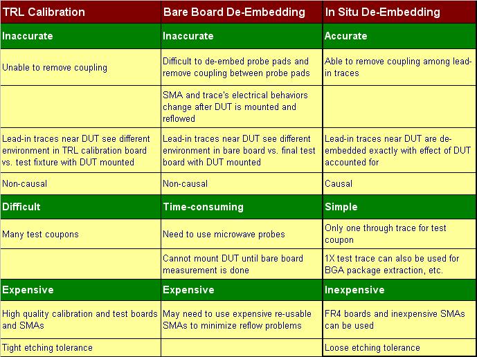 下圖整理了 ISD 軟體的 De-Emdedding 功能相較於 TRL 以及 bare board de-embedding 如何能更精確,經濟以及容易使用。