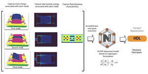 - 創新的SME(系統模型萃取)能夠系統地分析MEMS device動力學特性,萃取 device 特徵參數,能夠將一個大型的FEA模型轉換成一個精確的N自由度能量模型,導入到SYNPLE模組中進行模擬,最終獲得與全FEA分析一致的精確結果,而計算速度提高1000倍